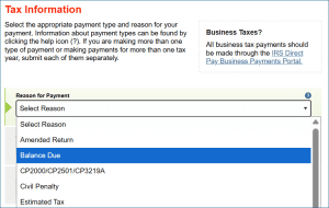 Click the link below and under “Pay personal taxes” click the “Make a payment” button. This will take you to the IRS’s Direct Pay website.