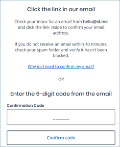 You will be asked to confirm your email address. Click on the link that was sent to your email or enter the 6-digit confirmation code.