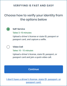 This step will be completed on your cellular device. Click on the link that was texted to you and then follow the prompted instructions. You will need to upload pictures of the front and back of your ID, and then it will take a short video of your face to match your ID to you. One this is completed, go back to the browser tab that you were on before this step.